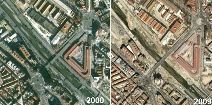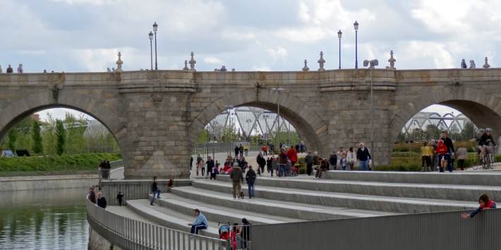 Más al norte el puente de Toledo (11), un testimonio de la ingeniería barroca, que antes del enteramiento ya era únicamente peatonal, mantiene esa condición liberándose de varios de los puentes de las vías de conexión con la autovía, que han alterado su trazado.