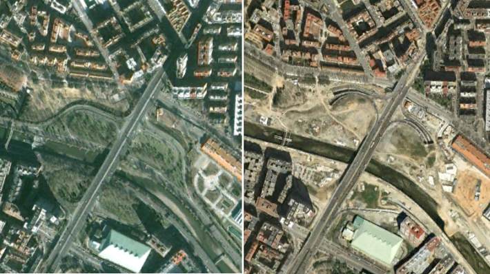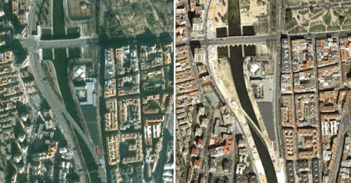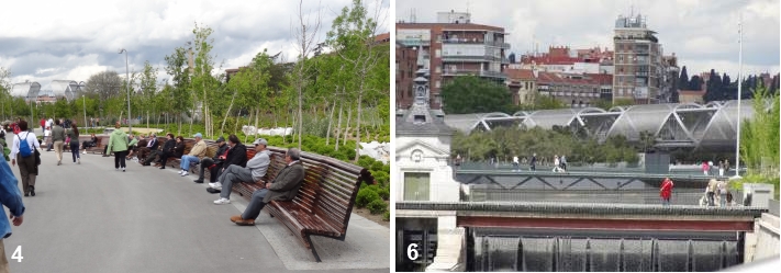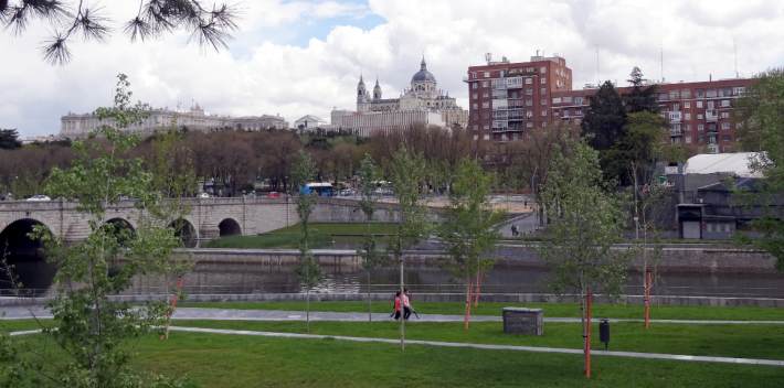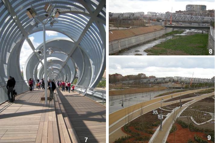 Más al norte, a la altura del Puente de Segovia (otro puente histórico interesante) (19), una parte de la calzada de la antigua autopista se mantiene como puente peatonal, marcando la llegada a la zona monumental, donde el parque lineal está frente al Palacio Real y el Campo del Moro, su jardín. El enterramiento ha permitido mejorar sustancialmente la calidad de este espacio y su percepción.