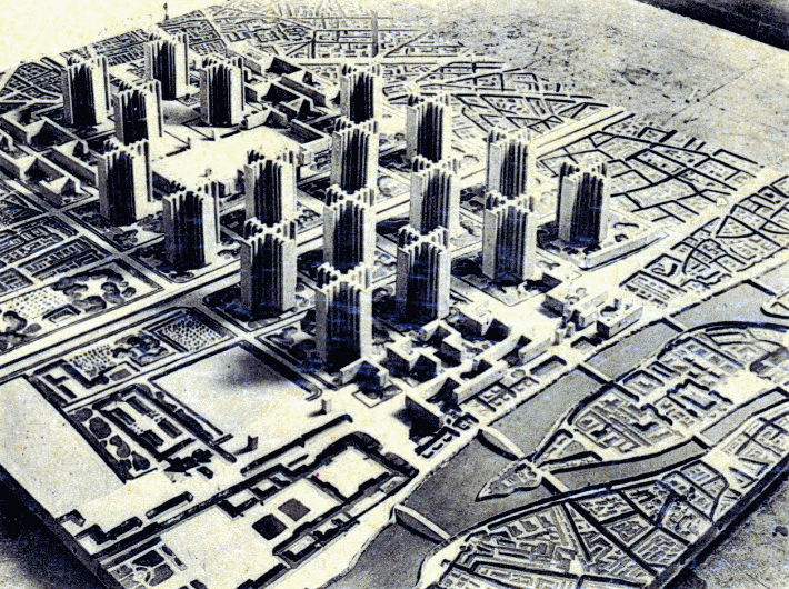 El Plan Voisin de Le Corbusier, patrocinado por un fabricante de automóviles, proponía destruir una gran parte del tejido histórico central de París y el trazado de grandes autopistas en la orilla derecha.