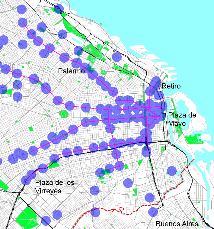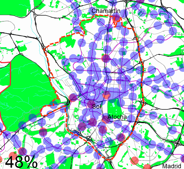 Como la mayor parte de las grandes redes de metro, sirve principalmente a relaciones centro- periferia; su crecimiento ha reforzado el papel nodal del centro histórico por la conexión de líneas confluentes. En ausencia de un ámbito central administrativo fijo, tomando como referencia el ámbito del Proyecto Madrid Centro el 48% de su ámbito está a menos de 300 m de una estación de metro. Es una proporción similar a la que se da en París; en Manhattan aparentemente la proporción es similar. Mumbai, una ciudad que prevé implantar una red de metro próximamente, apoya su sistema de transporte público en la red ferroviaria, con una cobertura menos extensa. Buenos Aires combina una red de metro relativamente poco densa con el ferrocarril. Los siguientes planos muestran las redes descritas de dichas ciudades a la misma escala, así como los radios de 300 m en torno a las estaciones.