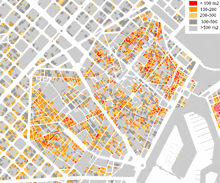 Plano catastral del casco antiguo de Barcelona en la actualidad y superficie de parcelas. A pesar de los 150 años transcurridos y de las sucesivas operaciones de transformación, aún se aprecia la presencia de una alta proporción de pequeñas parcelas y la pervivencia de parte de la trama medieval, marcada por algunas aperturas previstas por Cerdá como la vía Laietana.