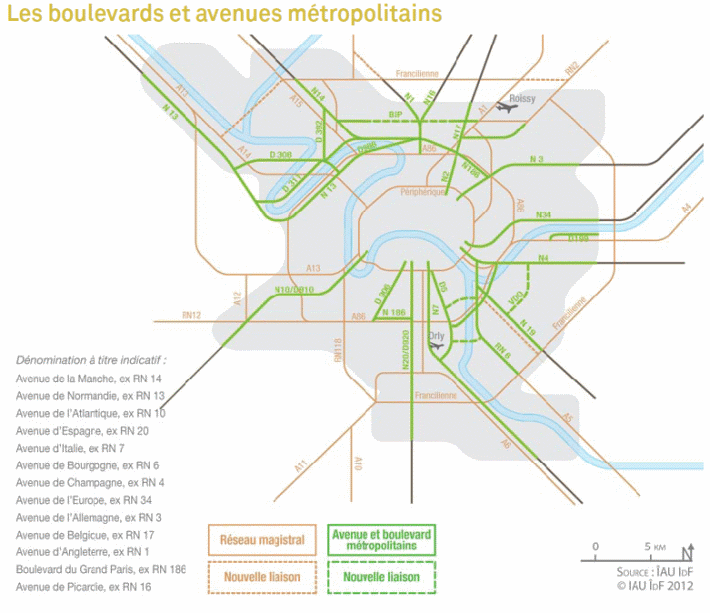 - Medidas de calmado de tráfico en el Peripherique y los tramos iniciales de las autopistas radiales, así como un tratamiento especial para los bulevares y avenidas metropolitanas. Aunque existen algunos proyectos de nuevas autopistas (por ejemplo, una ronda de Roissy), no son la cuestión principal. El uso multimodal de las autopistas, integrando carriles reservados para vehículos de alta ocupación y transporte público (como en la A-6 madrileña) se presenta como la nueva norma. El calmado de tráfico iría acompañado de nuevos usos en las actuales zonas de protección de carreteras, permitiendo la implantación de estaciones de autobus y equipamientos. Es una de las ideas más relevantes del SDRIF en términos ambientales, por la reducción potencial de emisiones de gases de efecto invernadero.