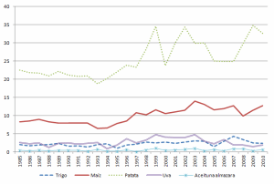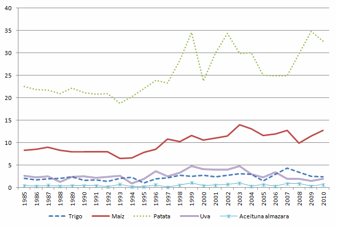 Evolución durante los últimos 25 años del rendimiento agrícola por hectárea en la Comunidad de Madrid