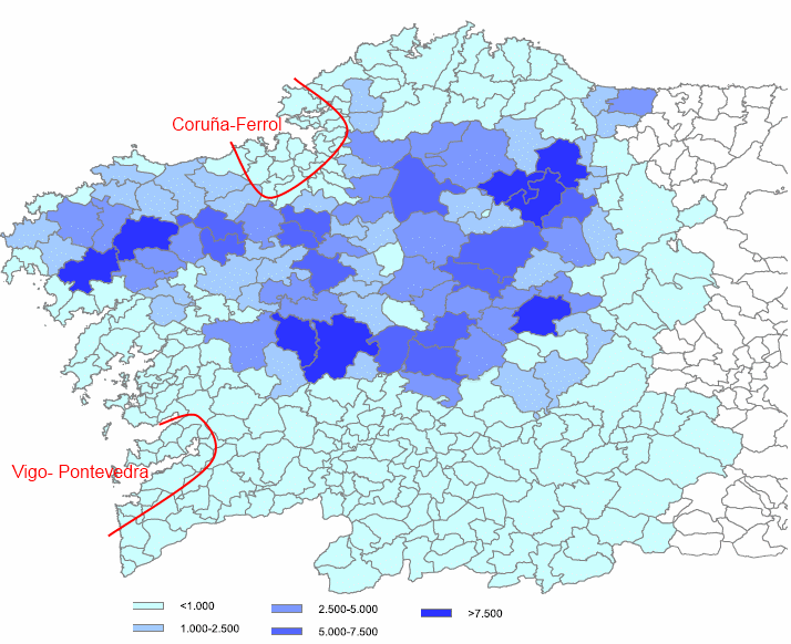 Número de vacas lecheras por municipio de Galicia en 2010. Se señalan las dos principales áreas metropolitanas de la región