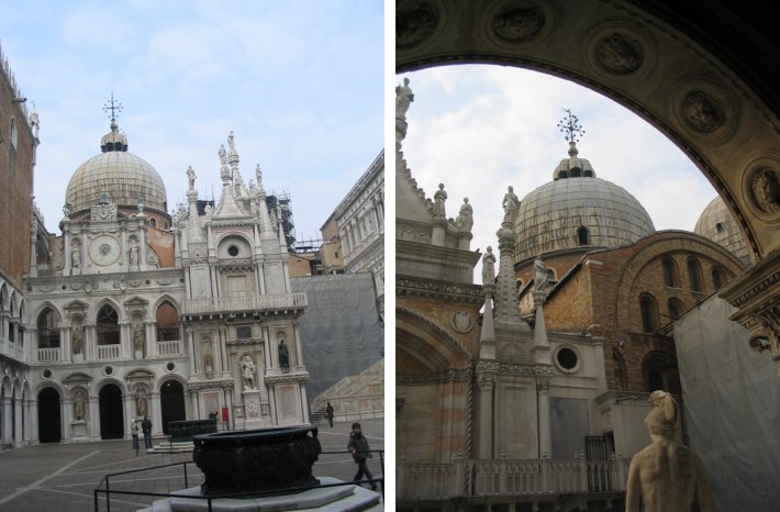 El edificio entero es una superposición de estilos y formas de decorar y organizar una arquitectura, con variaciones sorprendentes al pasar una esquina, pero siempre partiendo de ese requisito de acceso ceremonioso de una gran cantidad de consejeros al nivel más alto, y contando como compañera de patio con la Catedral de San Marcos.