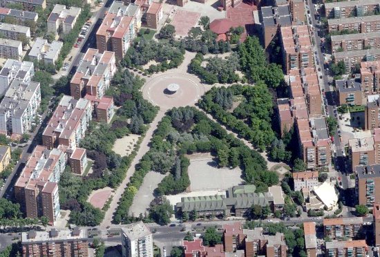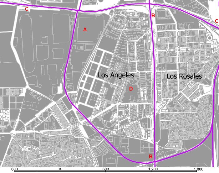 Ciudad de Los Ángeles es representativo del crecimiento urbano del sur madrileño durante el fuerte crecimiento económico y demográfico de la ciudad en las décadas de 1960 y 1970. La zona creció debido al empleo en la industria automovilística (A) y otras instalaciones industriales y militares, aprovechando su cercanía a la carretera de Andalucía (B-B) y la presencia de los ferrocarriles. Más recientemente, el barrio se ha visto también afectado por la circunvalación M-40 (C-C). El parque central (D) es el espacio público más relevante. La densidad residencial del barrio es «artificialmente» baja, dado que se incluyen en su delimitación antiguas zonas industriales y militares, en muchos casos vacantes.