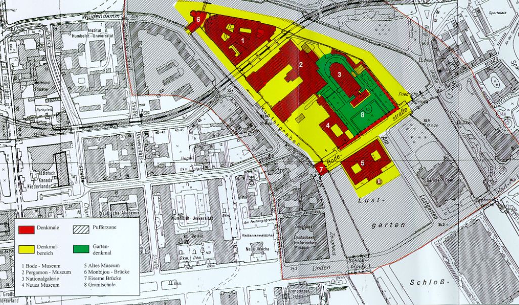 La Isla de los Museos de Berlín es inscrita en la lista del Patrimonio Mundial en 1999. La inscripción se motiva por el valor del conjunto de museos, que ilustran la evolución del museo moderno a lo largo de más de un siglo, y por el carácter de fenómeno social del museo de arte, derivado de la ilustración y difundido al público en general tras la revolución francesa; se considera que la Isla de los Museo es el ejemplo más sobresaliente de este concepto, en un emplazamiento urbano simbólico y central.
