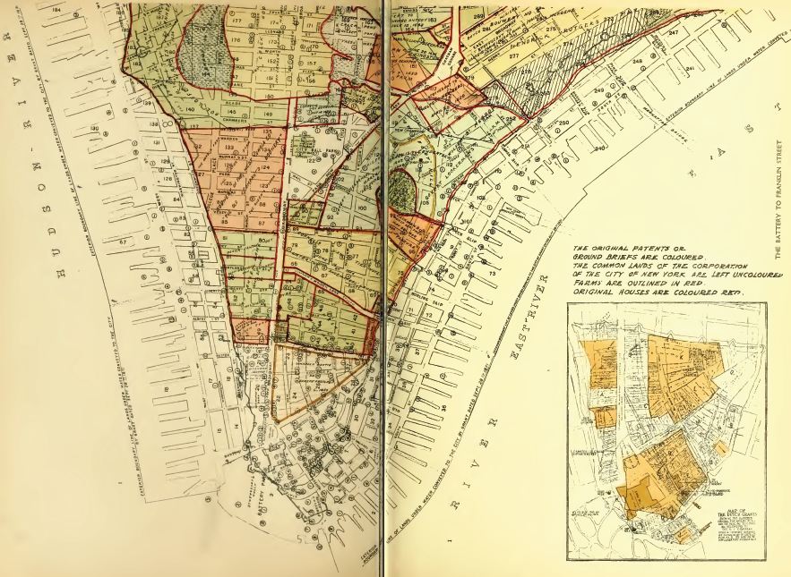 El mapa de las concesiones originales de suelo y delimitación de las granjas originales en el sur de Manhattan, sobre lo que hoy es la zona de Wall Street (pags 132-133 del pdf)