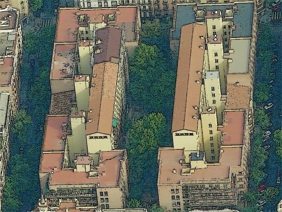 En 1931 Secundino Zuazo proyecta la Casa de las Flores, una manzana en el barrio de Gaztambide de Madrid destinada a albergar 288 viviendas en cuerpos edificados de 5 plantas. Es similar en muchos aspectos a las Habitations à Bon Marché de la Francia de la época, o a ciertos proyectos en Alemania y Austria en los que progresivamente se busca abrir los patios de la manzana hacia la ciudad, mejorando la ventilación. No obstante, en este caso sigue existiendo, además del patio central y sus aperturas en sentido longitudinal, un conjunto de patios de menor dimensión, al no haber ninguna vivienda pasante entre el patio central y la calle.