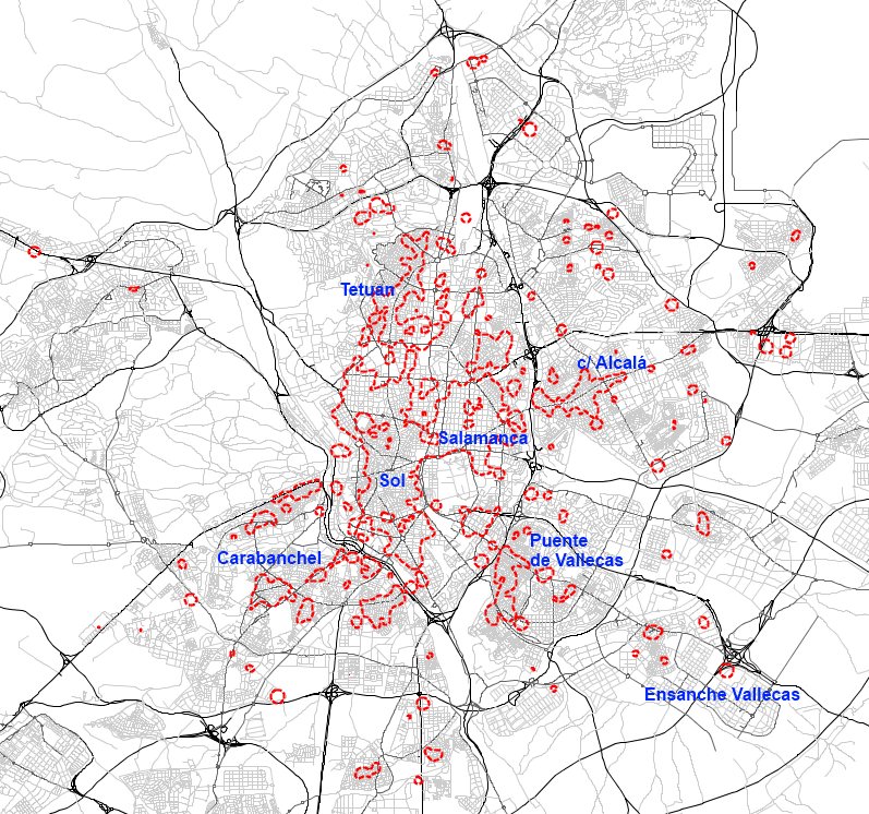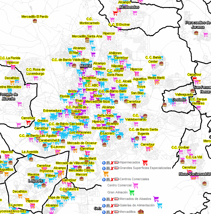 La centralidad comercial se orienta en función de la oferta y demanda de productos de compra no cotidiana (ropa, calzado, productos vinculados al ocio…). Estos productos se ven a su vez segmentados en función de calidades y precios. Como en muchas ciudades españolas, en el caso de Madrid El Corte Inglés es la única cadena de grandes almacenes y polariza claramente las grandes centralidades comerciales, con características diferentes en cada caso: popular y turístico en Sol- Callao, nivel más alto en el Barrio de Salamanca, oferta asociada a la presencia de grandes sedes corporativas en Azca, al este de Tetuan… Aunque existen grandes centros comerciales en el municipio, dentro de la M-30 son escasos y en situaciones periféricas. La centralidad más variada por su combinación con locales de ocio es la del Distrito Centro, en los ejes de Gran Vía, Preciados y Arenal, seguida por la del Barrio de Salamanca, para una demanda con un nivel adquisitivo superior.