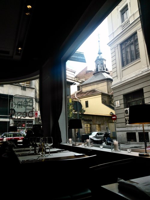 En Madrid, en la esquina más baja de la Calle de la Reina, una nota sobre como una simple ventana en planta baja desde un restaurante (10,95€ el menú, así que no especialmente prohibitivo) cambia la visibilidad de la iglesia de San José.