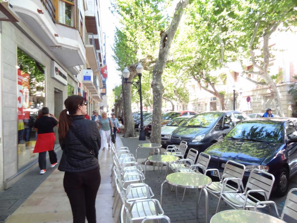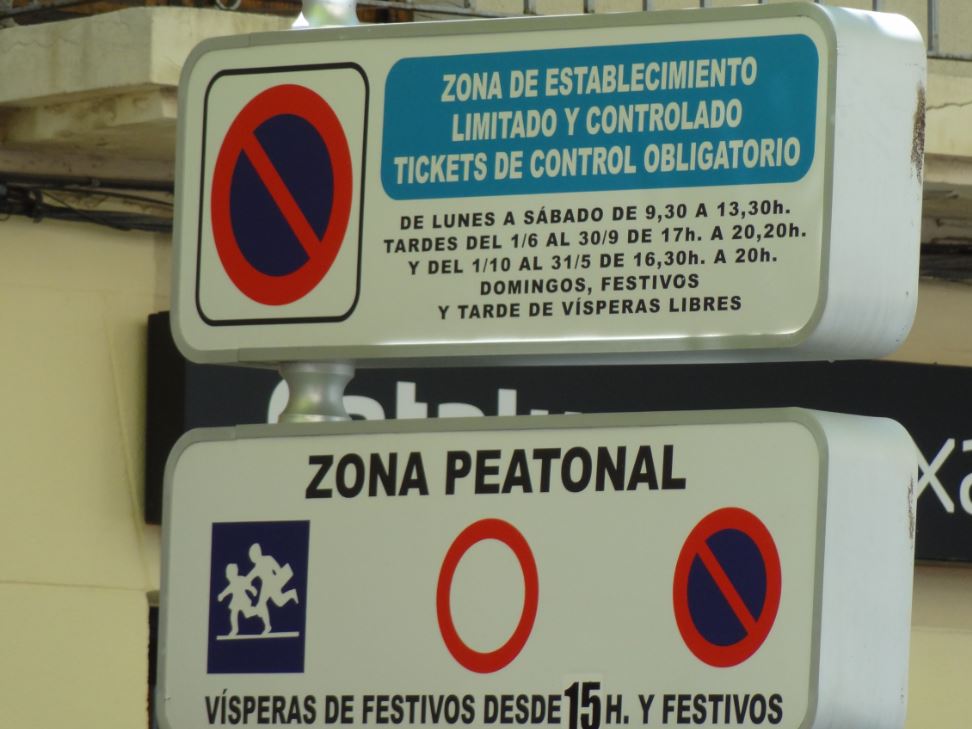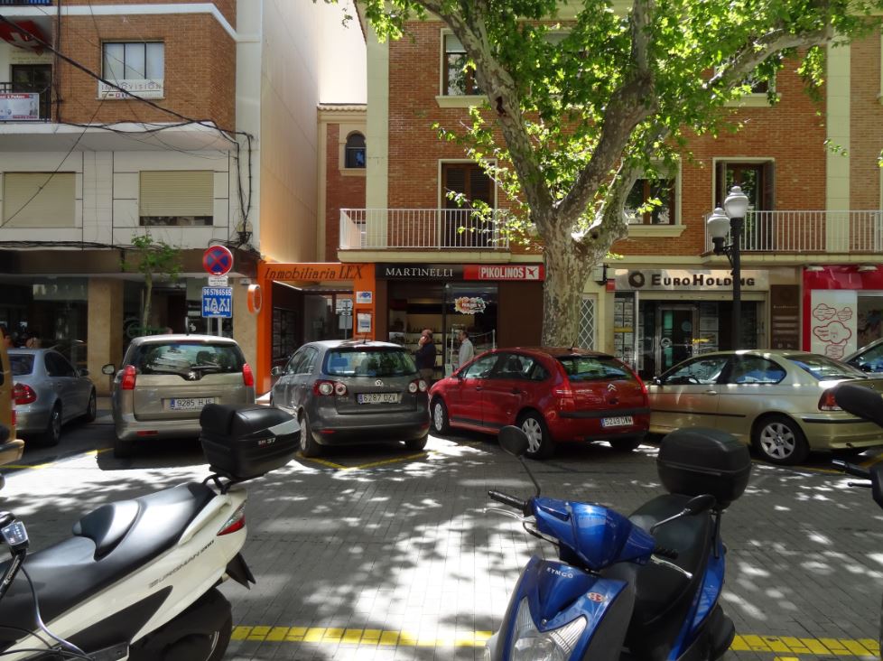 En ocasiones hay soluciones que intentan contentar tanto a los comerciantes que piden aparcamiento como a quienes quieren más espacio para el peatón. La ciudad alicantina de Denia juega un cierto papel de centralidad para varios municipios del entorno, y la calle Campos es uno de los espacios donde es más claro. No es necesariamente una calle con una arquitectura notable (más bien edificios típicos de la década de 1960 o un poco más tarde, con lo que eso implica en España), pero si que por posición urbana y la oferta comercial, así como la presencia de comercios de bienes de elección en las calles del entorno parece (al menos en una visita corta) el lugar de referencia.