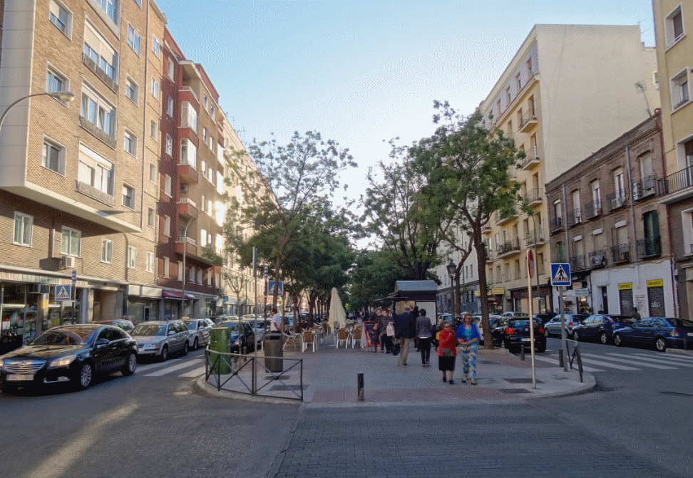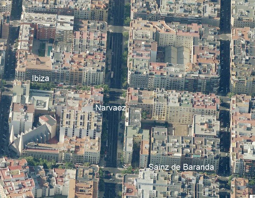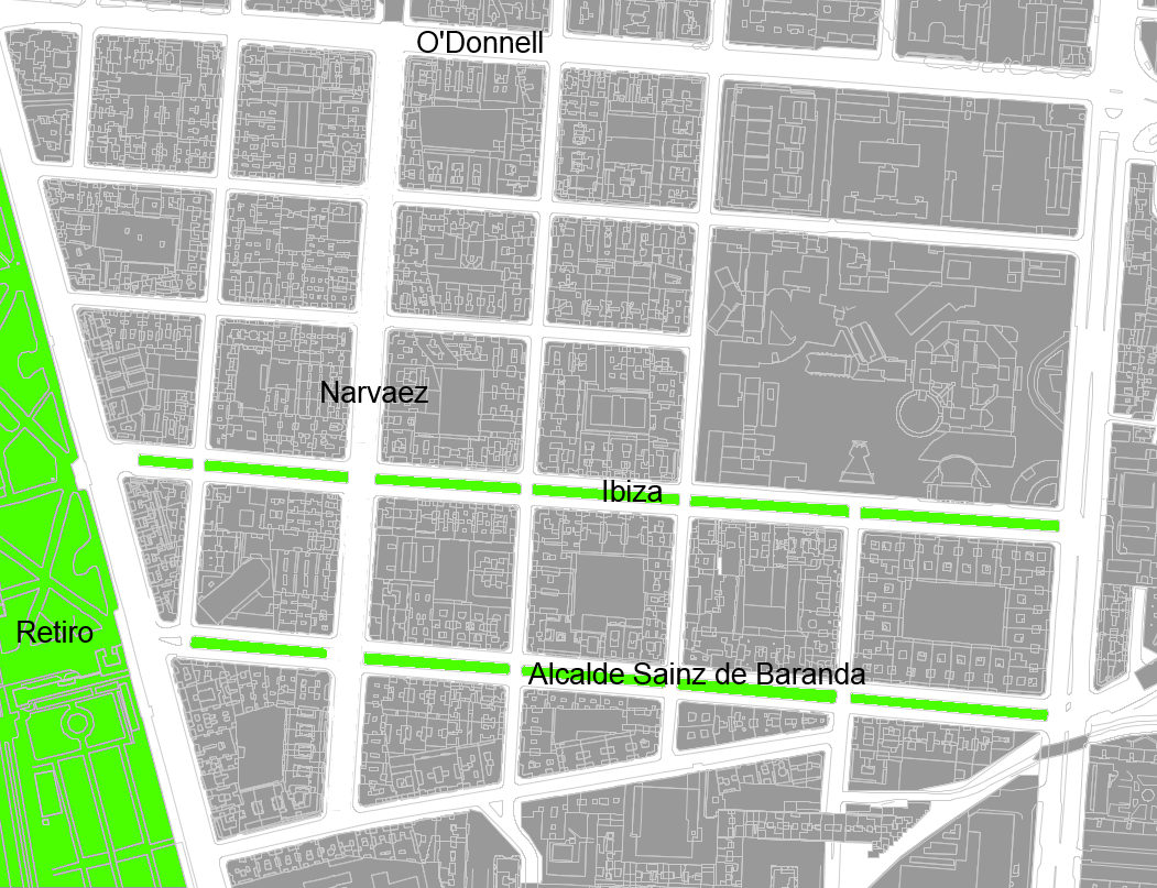 El título se refiere a nombres de calles, no a la isla… Con unos 720 metros de largo y 30 metros de ancho total, unas aceras laterales de poco más de 2 metros y un paseo central de 11, las calles de Ibiza y Sainz de Baranda en Madrid conforman un caso interesante. Tienen la misma anchura y los mismos tipos de edificios que Narvaez, la calle perpendicular a ambas. Conectan con el Retiro, el gran parque central de Madrid, y gracias a sus paseos centrales concentran una buena dotación de cafeterías y restaurantes. En realidad todo el barrio tiene una dotación comercial razonable (no es un gran atractor comercial como otras zonas un poco más al norte, pero esta lejos de ser de las peores zonas de Madrid). Pero la calle con más presencia comercial es Narvaez: aunque hay más espacio para el coche, conecta con la zona de grandes almacenes de Felipe II- Goya, las aceras son más anchas (unos 5 metros), y, probablemente, al haber menos arbolado “distrae menos” sobre lo que hay al otro lado de la calle (un parámetro esencial).