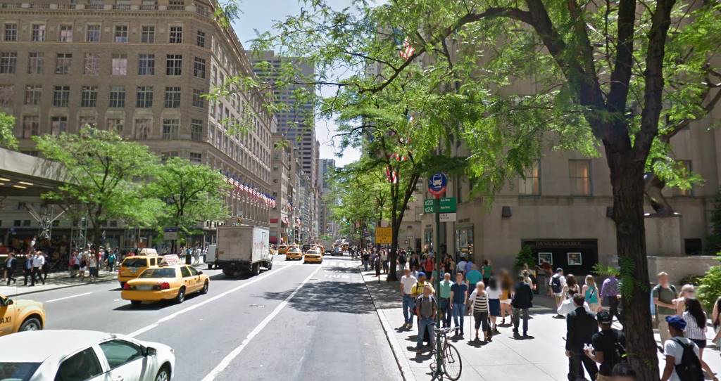 La quinta avenida tiene poco más de 28 metros de ancho. Hay tres carriles de dirección única (hacia el downtown) a los que se añade un carril bus, sin aparcamiento en la propia calle. Esto deja aceras de algo más de 6 metros. Siendo una calle asociada normalmente al lujo, es curioso ver que el pavimento es de hormigón, sin mayores florituras, salvo algún alcorque (hay pocos árboles) como los del Rockefeller Center. Es también llamativo que se aprecian muy pocos registros de infraestructuras subterráneas.
