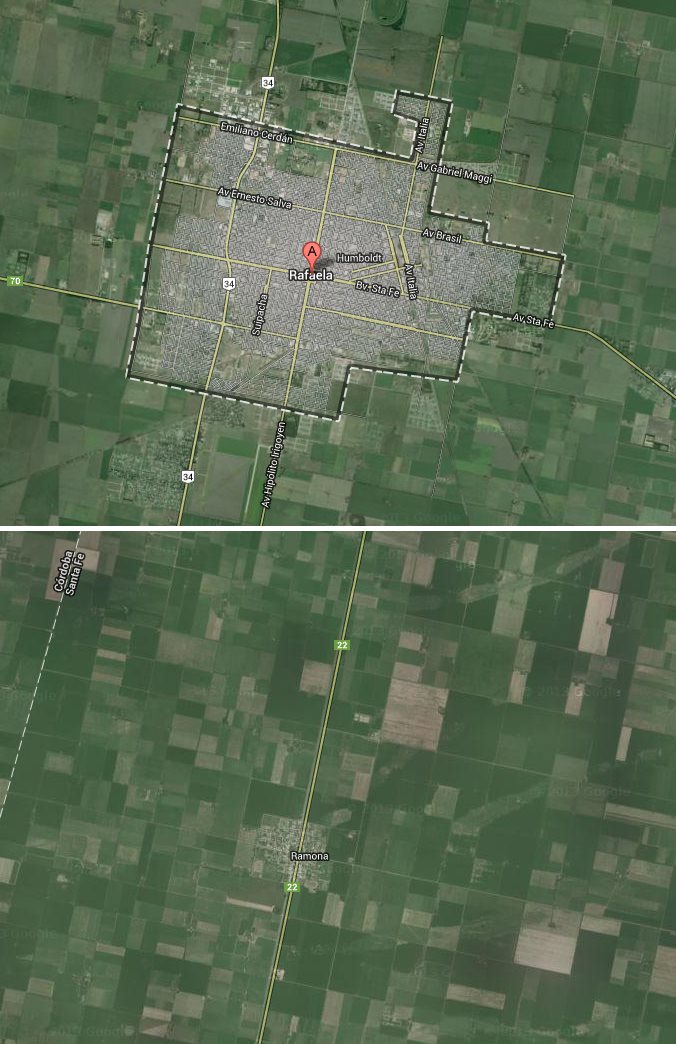 Rafaela es una ciudad de cerca de 100.000 habitantes en el centro- oeste de la provincia de Santa Fe, Argentina, con un cierto protagonismo en su territorio. Ramona es una comuna de algo más de 2.000 habitantes a unos 50 km de Rafaela. Buenos Aires está muuuy lejos…. Lo interesante es como, sobre un territorio totalmente mallado por una retícula de colonización agraria de una pampa que seguramente allí parece infinita, hay casi una auto-similitud digna de Mandelbrot en las formas…