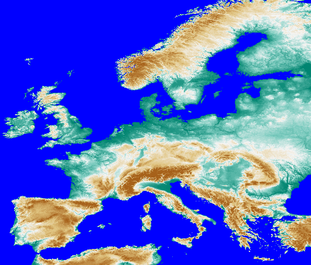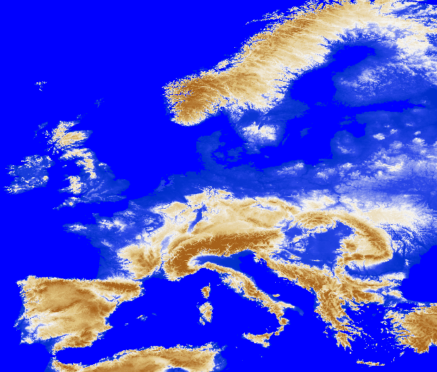 En su momento leí «La balsa de piedra», del escritor y premio nobel portugués José Saramago, un libro en el que la península ibérica se desgaja de Europa siguiendo con precisión las fronteras políticas: los Pirineos se cortan abruptamente por la frontera, y en un momento dado los andaluces se dirigen hacia Málaga para ver pasar el Peñon de Gibraltar (ya le pasaba algo raro en «Hector Servadac», de Julio Verne). Así que decidí pensar en un corte menos violento (o algo así…). Descargué el modelo de elevaciones SRTM para la península y datos a escala europea de la página de la Agencia Ambiental Europea. Si los océanos del mundo se elevaran 200 metros (por la razón que sea, cambio climático -cuyas previsiones están muy debajo de este valor- o la que se quiera imaginar) el conjunto de la península sería una isla… aunque bastante diferente de la que conocemos ahora.