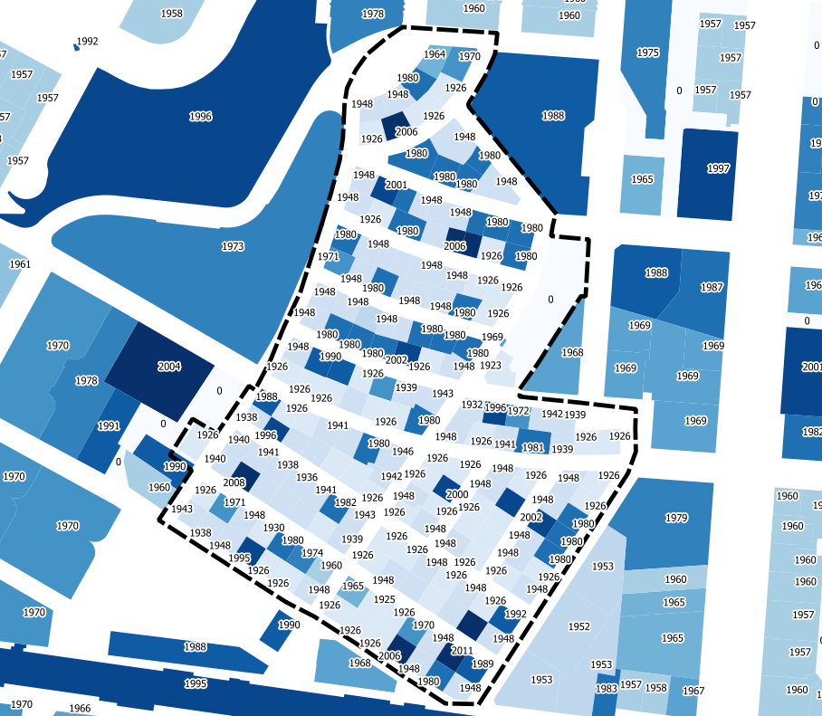 La edad de las construcciones es menos uniforme: una parte data de la época inicial, 1926, y una cierto número data de justo despues de la guerra civil 1936-1939; un puñado tienen menos de una década. Visitando el barrio puede verse que hay bastantes intervenciones de mediana intensidad recientes (la antigua periferia se ha hecho más central, y por tanto más atractiva…)