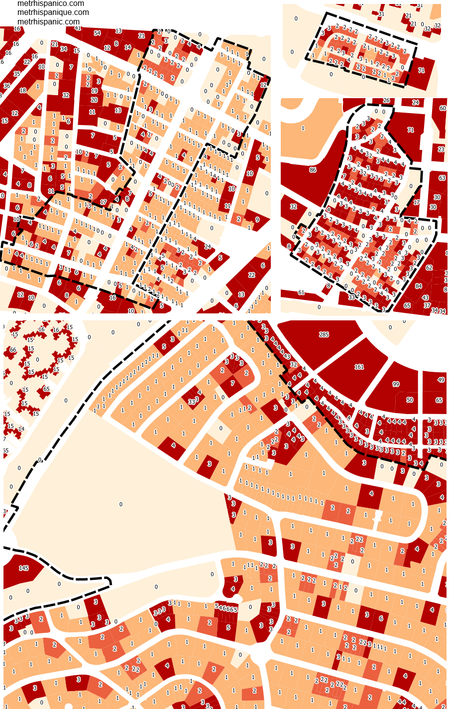 Volvamos a la pregunta de inicios de semana. ¿Ha habido o no densificación en estos tejidos urbanos?. Los datos catastrales (imagen superior, con todas las colonias a la misma escala, rotulando para cada parcela el número de bienes inmuebles residenciales) engaña, porque en algunas parcelas la codificación no parece ser correcta; a juzgar por los datos se están reflejando como bienes inmuebles residenciales dependencias auxiliares que a priori nadie reconocería como viviendas, aunque pueden ser indicios de una ampliación (hay que recordar que la finalidad del catastro es impositiva y no urbanística). Creo en todo caso que ha habido algún grado de densificación, pero sólo los datos censales difundidos en diciembre podrán ayudar a confirmar si ha sido así…