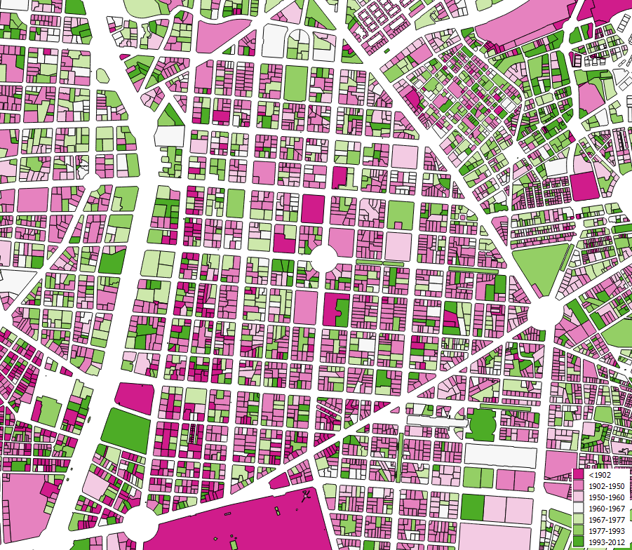 Madrid, capital de un imperio desaparecido, una ciudad del viejo mundo. Y sin embargo, esta zona céntrica tiene un parque edificado que es casi más joven que el de algunas zonas céntricas de Mannhattan, que casi parece un casco histórico en toda regla (aunque los edificios son más altos, muchos son bastante viejos). Desde luego, el Barrio de Salamanca es un ensanche del siglo XIX, pero es una prueba de que, pese a lo que muchos piensen desde la distancia, las ciudades europeas están lejos de ser caparazones herméticos que preservan viejas glorias. Hay que recordar, como he dicho antes, que estos mapas se basan en datos catastrales, que en algunos casos (quizás 10%) asignan a los edificios un año de construcción que no es el original, sino el de la última rehabilitación integral (imagino que hay a quien le gustaría recibir el mismo tratamiento tras una cirugía…)