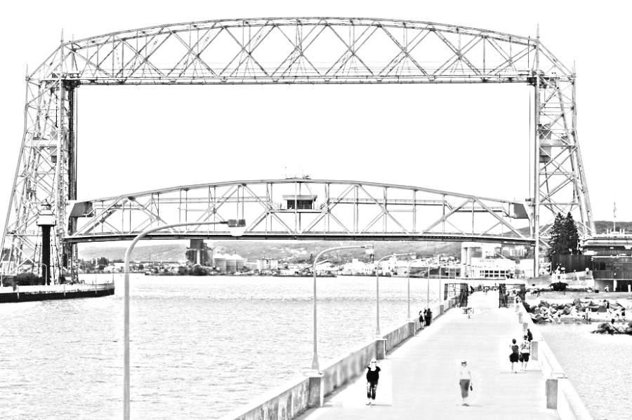 Cuando los puertos han tenido la idea de colocarse en zonas transitadas suele aparecer la necesidad de puentes que, en ocasiones, deben asegurar difíciles compromisos. En Duluth existe un puente levadizo, conocido localmente como el Aerial Lift Bridge, que es una de las imágenes características de la ciudad. Creado para mantener el acceso a la península de Minnesota Point tras la apertura de un canal de navegación. Después de una etapa inicial como puente transbordador (como el de Portugalete en la ría de Bilbao) fue transformado a su actual disposición como puente de tráfico rodado con un tablero que se desplaza verticalmente. Por otra parte, como muchos de los puertos de esta zona de los grandes lagos, en los que el mineral de hierro es una de las cargas más frecuentes, los artefactos para el trasbordo del mismo desde los trenes hasta los barcos son impresionantes (basta ver el siguiente video de un puerto en Michigan http://www.youtube.com/watch?v=rzWwTOt39Es&list=PL7eOOJxsVrlgY0de0Osk7DTF8l2r9ksOb&feature=share&index=3); hay ejemplos similares (generalmente ya no en funcionamiento) en zonas españolas como Almería o Huelva.