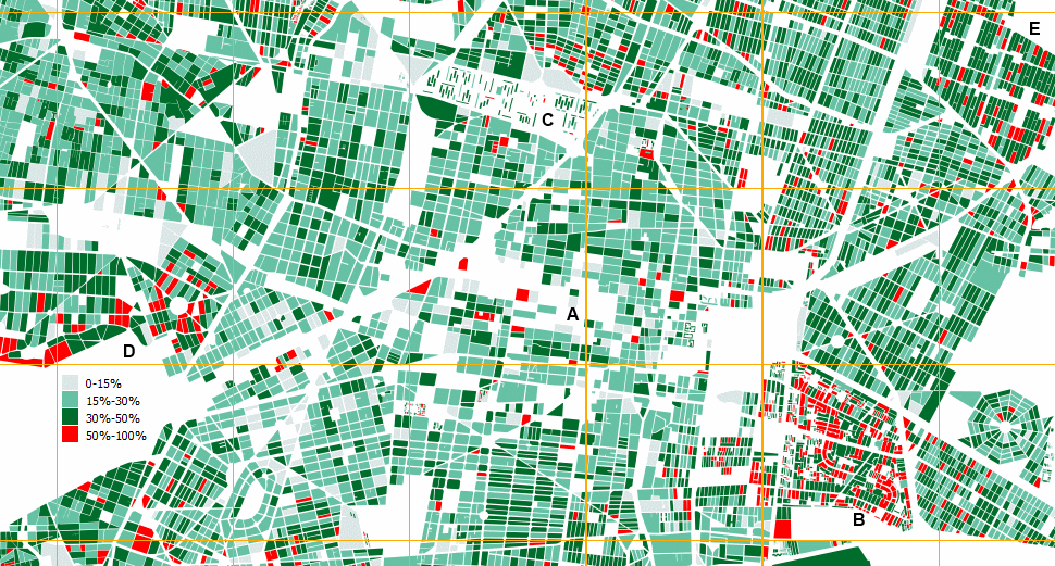 En la zona central de la ciudad de México los hogares cuyo jefe (en el sentido censal) tiene 60 o más años son claramente minoritarios (para dar una idea de la escala, la rejilla naranja superpuesta son 2 km). En la zona histórica en torno al Zócalo (A) apenas son relevantes, algo que resultaría inaudito en casi cualquier ciudad histórica europea. Hay zonas, como las colonias Jardín Balbuena (B) o Rincón del Bosque (D), espacios de alto nivel económico donde la presencia de mayores es mucho más importante; la Colonia San Juan de Aragón (E) es un ejemplo de un espacio que también tiene una presencia relativamente alta de hogares con jefaturas mayores de 60 años, pero con una situación socioeconómica menos desahogada. El barrio de Tlatelolco (C), uno de los espacios míticos de la arquitectura moderna mexicana de vivienda social, muestra un menor envejecimiento, pese a que por su época de construcción en otros países sería un firme candidato al envejecimiento. Estas afirmaciones se basan en la edad del jefe de hogar, lo cual en todo caso es sólo una aproximación.