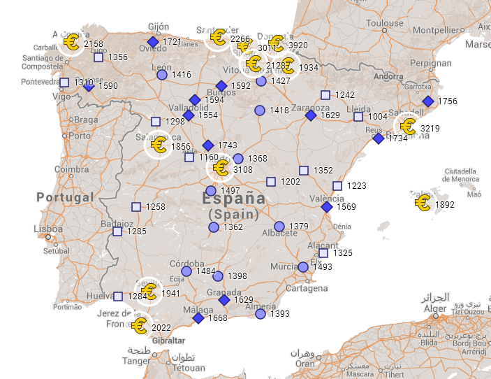 Los artículos recientes, un vistazo a lo que se puede comprar con una cantidad de dinero dada en diferentes ciudades de Europa, y siempre que es posible con un plano de lo que se está comprando, muestran lo relativo del valor del dinero, que depende de muchos factores locales. Aplicando la misma metodología a las 48 capitales de provincia españolas ubicadas en la península ibérica y Baleares, y utilizando datos de idealista.com, se puede apreciar que el propio contexto de crisis, que ciertamente afecta a todo el país, no tiene el mismo impacto por precios en todas partes.