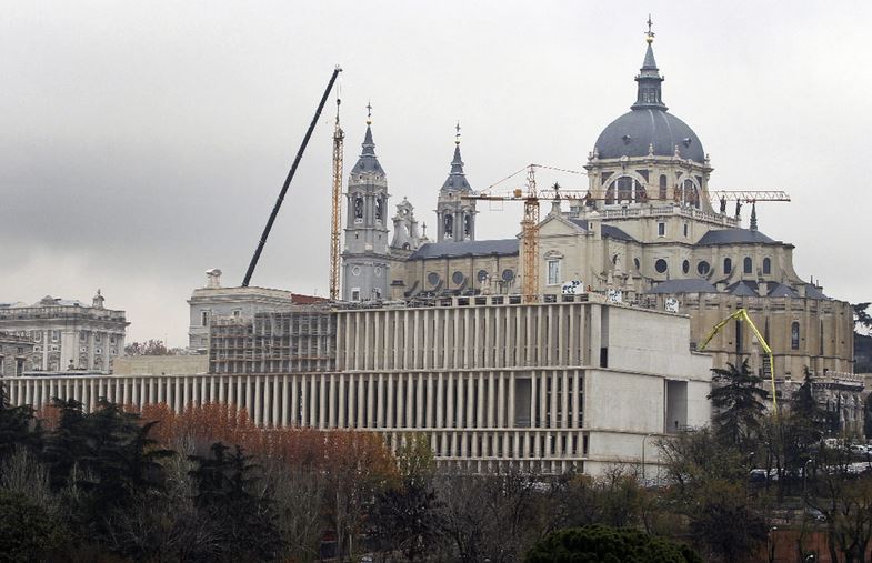 Curvas de nivel con intervalo de 1 m y malla de referencia de 100 m. La zona del río presenta datos extraños, dado que los datos de origen probablemente fueron tomados durante la obra de la M30.Foto de los momentos iniciales de la obra para el Museo de Colecciones Reales, según http://www.edicioneslalibreria.es/la-historia-de-madrid-bajo-el-museo-de-colecciones-reales/Estado actual del museo