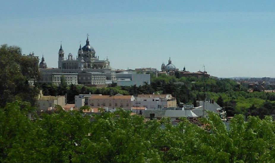 La zona vista desde el norte. El Palacio es la masa que hay bajo la cúpula de la Almudena, a la izquierda