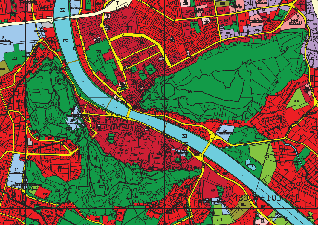 El Flächenwidmungsplan (Plan Municipal) de 1997 establece con claridad la protección de las dos grandes colinas, rodeadas por los ámbitos de suelo urbano (color rojo). La ciudad, crecida inicialmente entre las dos colinas, ha ido rellenando hoy todo el espacio medianamente llano. La proporción geométrica entre colinas, río y tejido urbano hace que, pese a la densidad edificatoria de este, el resultado esté equilibrado en el centro histórico.