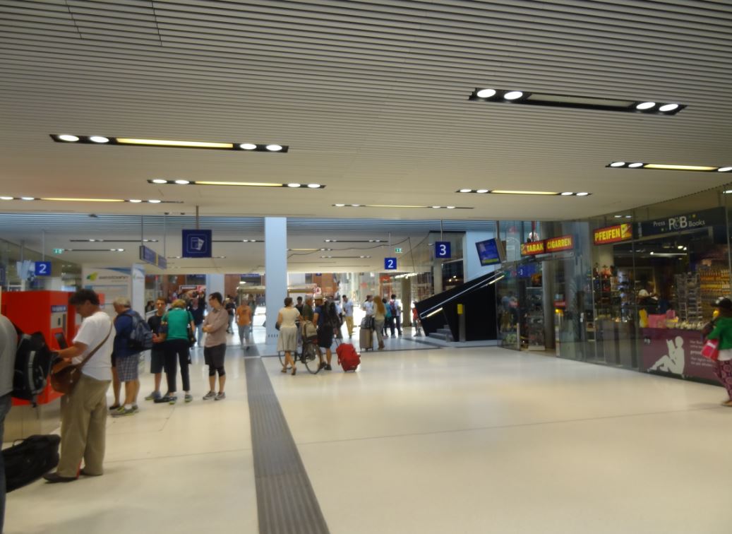 El uso del acero con estructuras basadas en apoyos en Y muy espaciados no es necesariamente la solución más barata, pero el resultado es interesante; siempre es difícil decidir cual es el precio correcto para algo que se va a ver todos los días y por tanto puede acabar aburriendo. Bajo el nivel de vías el pasaje transversal a la estación, que conecta dos barrios de la ciudad, es sencillo pero bien iluminado, y a ello contribuye que las aperturas para las escaleras hacia los andenes no se limiten a una pequeña dimensión, sino que vayan generosamente de un lado a otro del pasaje. En mis fotos no se ve, pero recuerdo que había algunos detalles interesantes en la forma de adaptar el suelo del pasaje a las diferencias de nivel entre sus extremos.