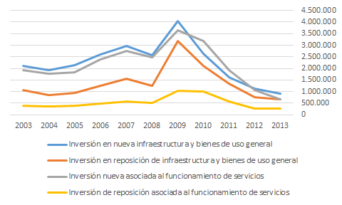 Inversión: La inversión en nueva infraestructura y bienes de uso general era casi un 7% en 2003, mientras que en 2013 era de un 2,2%. La inversión para el mantenimiento de esos bienes e infraestructuras se redujo de un 3,4 a un 1,6% en el mismo periodo, y una evolución similar han seguido las inversiones para funcionamiento de servicios tanto nuevas como de mantenimiento.