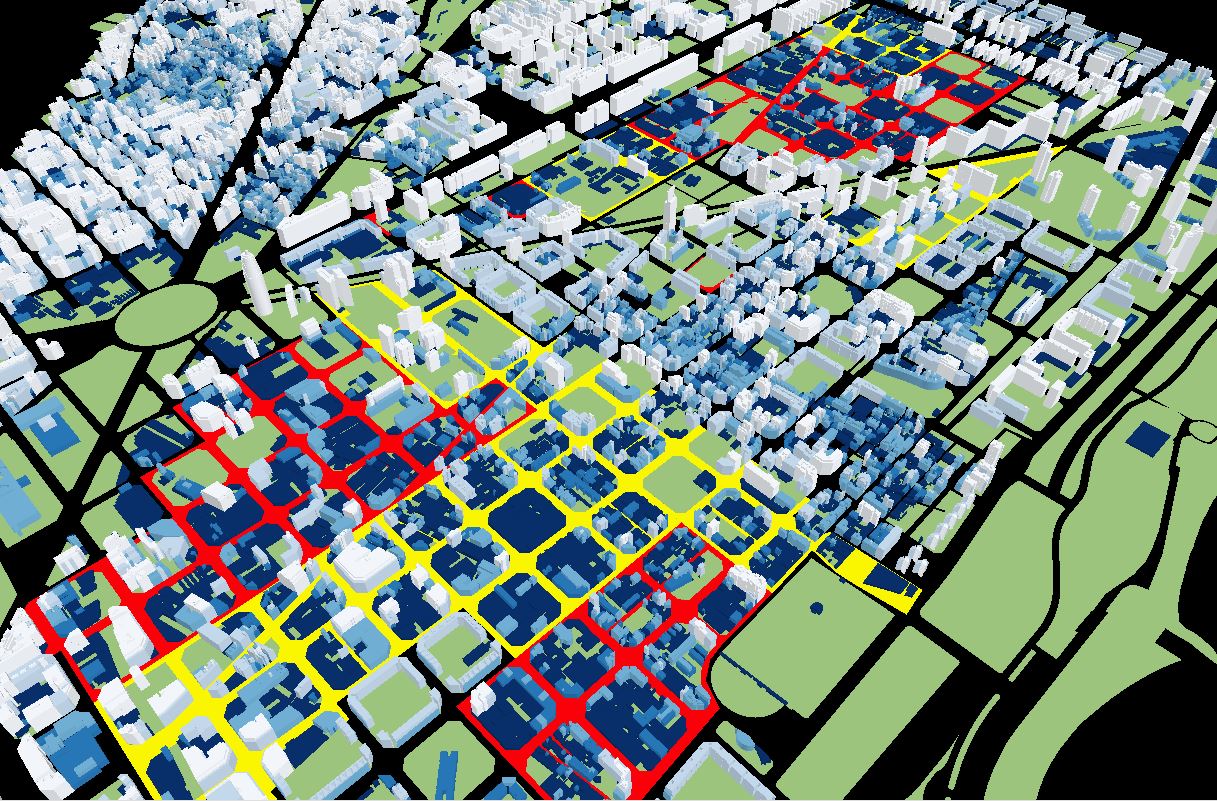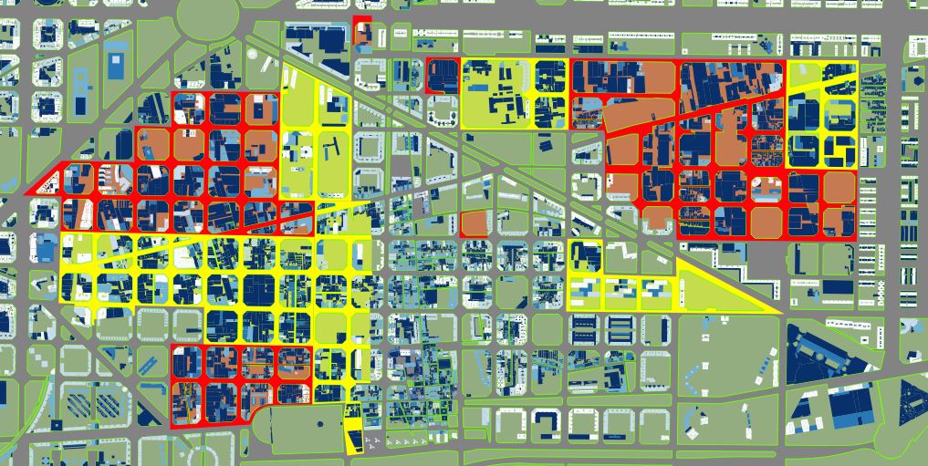 En origen la zona está ocupada mayoritariamente por naves industriales. Se plantea pasar de una edificabilidad permitida en el planeamiento de 2 m2 edificables por m2 de suelo en la situación inicial a 3 m2/m2 en la situación final en ámbitos de transformación (amarillo) y 2,2 en el resto (rojo). Esto parece un incremento pequeño, de sólo un 50% en el caso más alto; pero el cambio de tipología edificatoria (paso de naves industriales a edificios con fondo más estrechos) hace que las alturas y, consecuentemente, la imagen urbana, cambien, y mucho. Una parte del incremento de la superficie edificable sirve para pagar las mejoras de la urbanización.