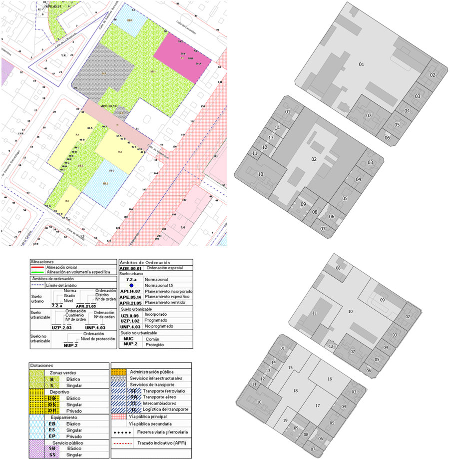 Figura 5. Izquierda: Ordenación del APE 03.10 “Metro”. Derecha: plano catastral a 4 de febrero de 2002 (superior) y desde el 9 de enero de 2018 (inferior)