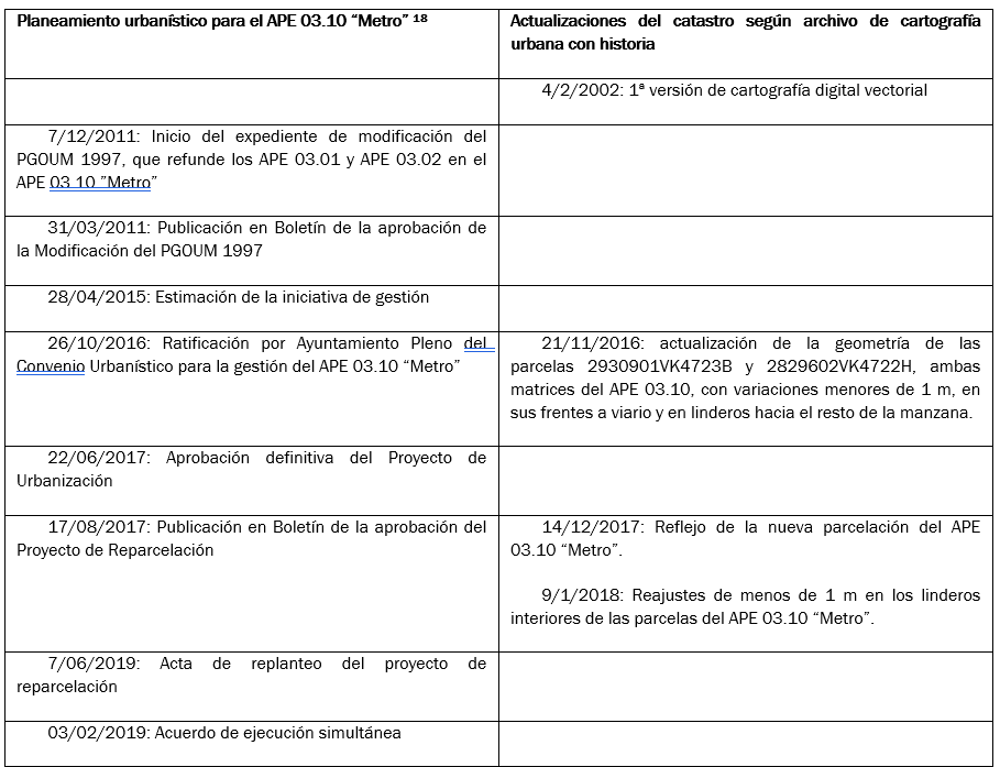 Como base de trabajo de campo se contrastan los datos catastrales con fuentes como las aportadas por el portal urbanístico del Ayuntamiento de Madrid, disponible en la direccion http://www-2.munimadrid.es/urbanismo_inter/visualizador/index_inter.jsp. La descripción catastral de la manzana sur en la actualidad comprende 18 parcelas, tras la división a través del APE 03.10 “Metro) de la antigua parcela 02, y la norte cuenta con 11 parcelas, tras la división en cuatro de la antigua número 01 a través de la misma operación. La secuencia temporal de registros sobre planeamiento y catastro en esta zona es la siguiente: