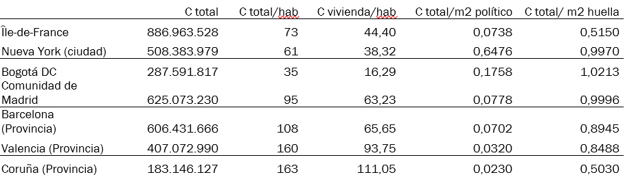 De acuerdo con los criterios morfológicos utilizados, la huella construida ponderada de la Comunidad de Madrid tiene una densidad casi equivalente, en términos globales, a la de las áreas centrales de Nueva York o Bogotá, mientras que las provincias de Barcelona y Valencia presentan valores algo más reducidos, pero igualmente elevados. Sin embargo, la provincia coruñesa y la Région Île-de-France presentan valores mucho más reducidos, asociables a dinámicas de dispersión más acusadas.