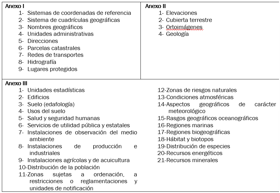 En el contexto general de la Unión Europea la Directiva 2003/98/CE, de 17 de noviembre de 2003, del Parlamento Europeo y del Consejo, relativa a la reutilización de la información del sector público, supone un marco para el desarrollo del concepto de datos abiertos. En el aspecto específico de la información espacial, especialmente relevante para el planeamiento territorial y urbanístico, la Directiva 2007/2/CE, del Parlamento Europeo y del Consejo, conocida como INSPIRE (Infrastructure for Spatial Information in Europe) ha generado un marco de referencia de gran utilidad. Se ha definido un conjunto de temáticas prioritarias para su publicación relacionadas con el medio ambiente (aire, naturaleza, agua, ruido, residuos, emisiones industriales y accidentes industriales) y se ha agrupado en tres anexos una relación de contenidos temáticos, relevantes para la elaboración del planeamiento territorial y urbanístico.