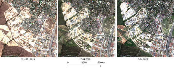 Figura 3. Evolución de las imágenes de la zona oeste de Boadilla del Monte obtenidas por la constelación Sentinel 2 para los días 12 de julio de 2015, 17 de abril de 2018, y 3 de abril de 2020