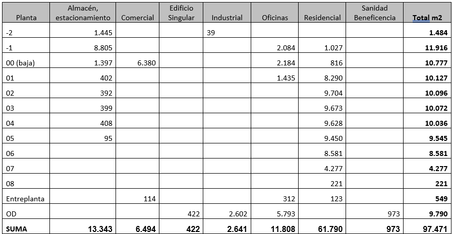 Los datos sobre las edificaciones dan cuenta de la presencia de 2007 registros de unidades constructivas, de los cuales 5, correspondientes a las parcelas de la manzana sur en curso de edificación, registran 0 unidades y superficie 0. Para los 2.002 registros restantes, 758 corresponden a uso de vivienda, con un total de 54.730 m2 construidos específicos de esas viviendas y 60.380 m2 construidos de los bienes residenciales en que se incluyen (contando con partes comunes y elementos asociados dentro del bien inmueble). En la descripción de la distribución por planta de los usos se codifican hasta 2 sótanos y 8 plantas sobre rasante, además de entreplantas, y las parcelas pertenecientes al APE se codifican con planta UE. El resumen de los datos por planta y uso es el siguiente: